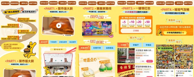 基于美团平台的本地生活服务生态,专题页不仅成为链接活动参与者的重要线上窗口,也为赴澳旅客提供了品味澳门街头美食的地道旅行攻略。在内容上,专题页立足本土美食文化推出“菜市场大厨”“环球小吃汇”“招牌菜比拼”3条美食主题路线,通过一份“澳门街头美食地图”,串连熟食街市、小吃店、茶餐厅等富有澳门特色的街头美食场景。