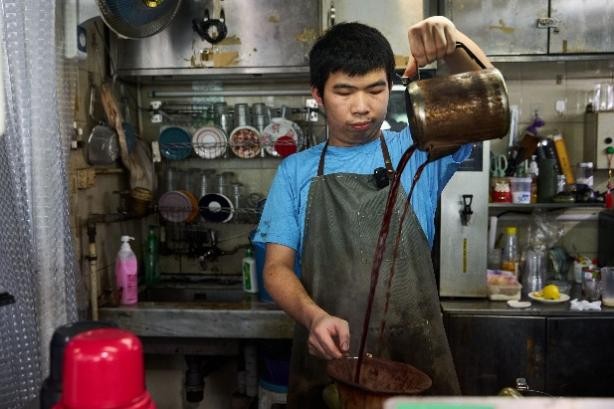 营地街市“强记奶茶咖啡”店主卫文在制作瓦煲咖啡