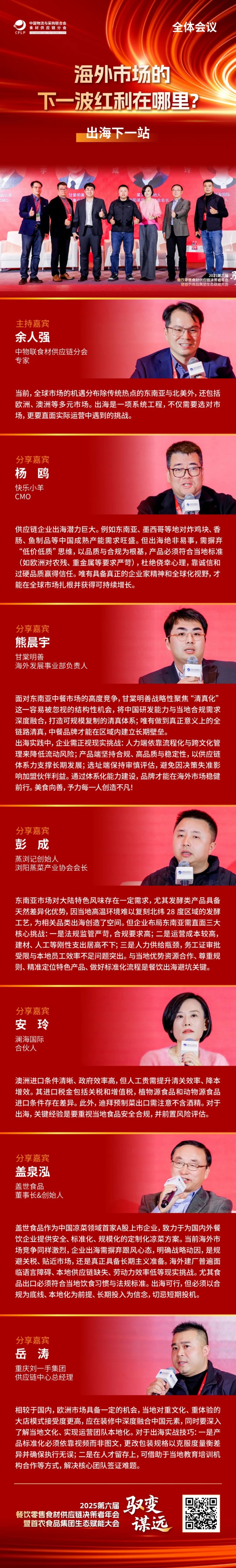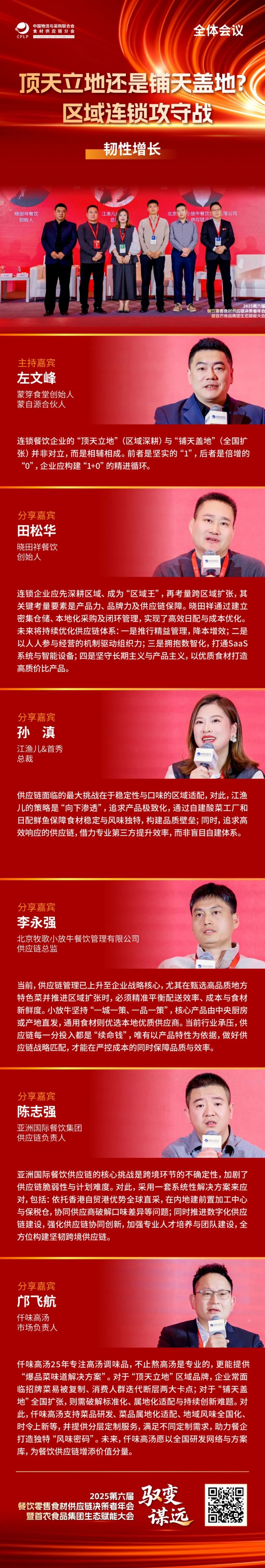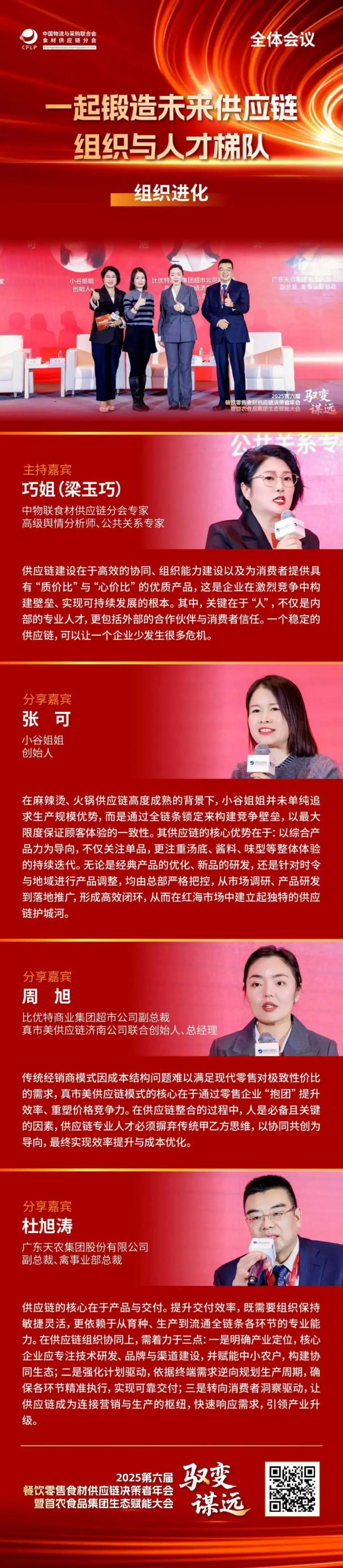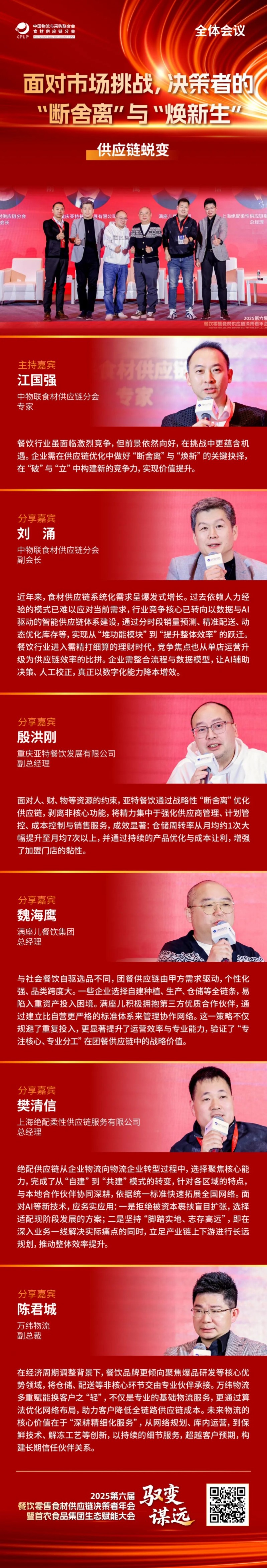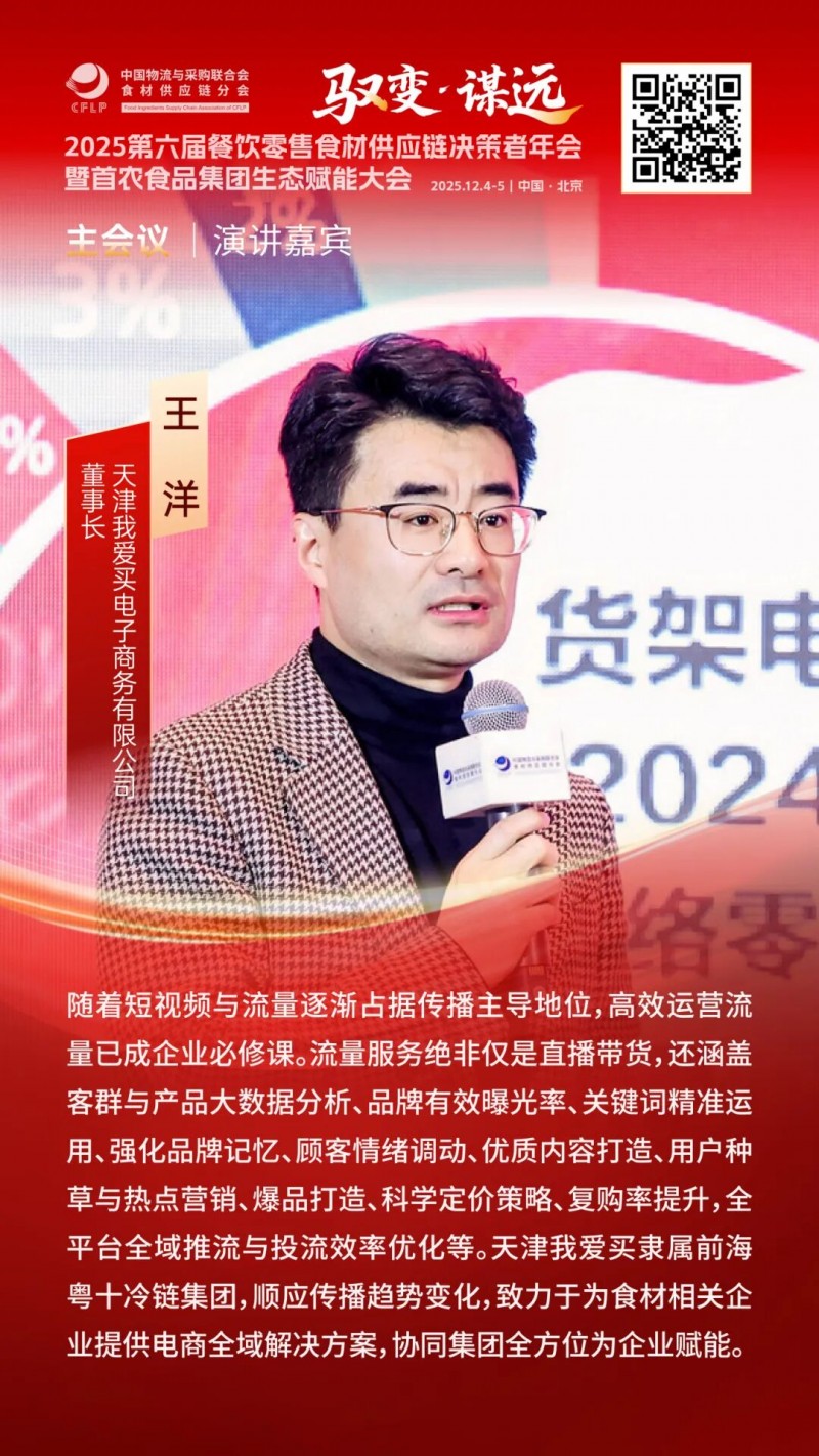 下午的全体会议精准锚定细分赛道,以实战路径探索与系统重构升级为核心,围绕数智驱动下餐饮零售食材供应链的“效率革命”、“组织进化”中的人才引擎构建、“韧性增长”视角下的区域连锁攻守战、“供应链蜕变”进程中的“断舍离”与“焕新生”、以及“出海下一站”蕴藏的市场红利等核心议题,展开深度对话与智慧交锋。全体会议由中国物流与采购联合会食材供应链分会专家&沃尔玛前副总裁王玉雄主持。